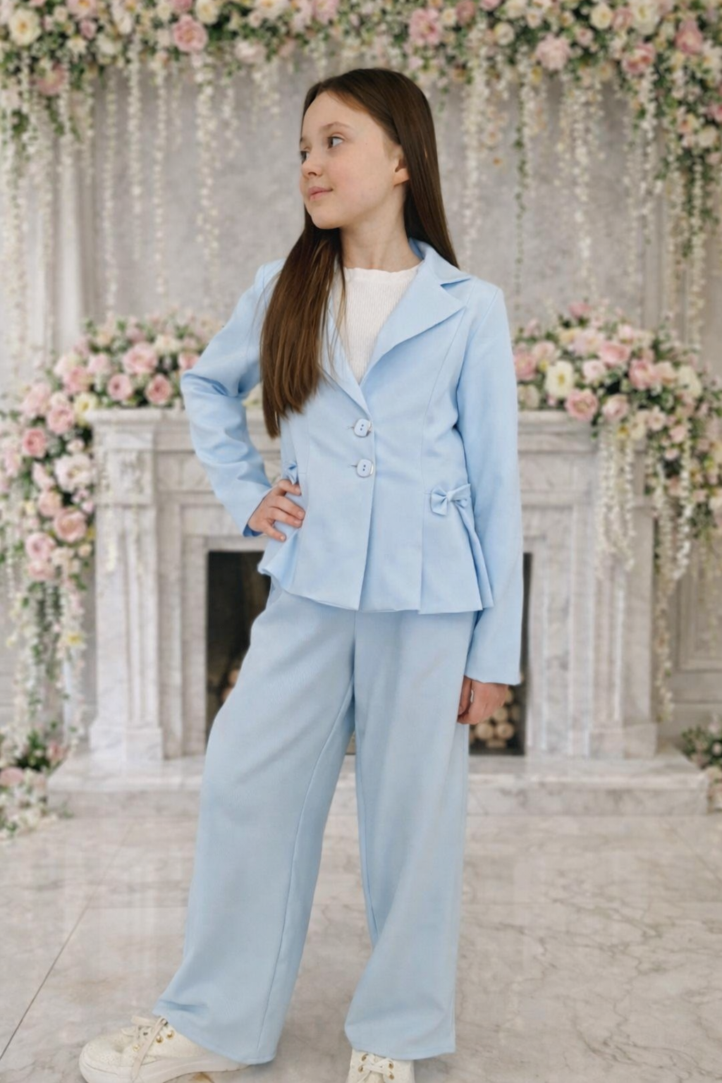 Błękitny komplet wizytowy dla dziewczynki z kokardkami