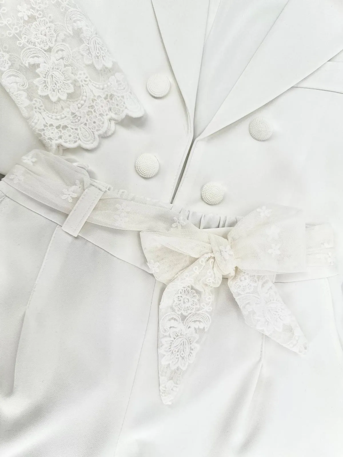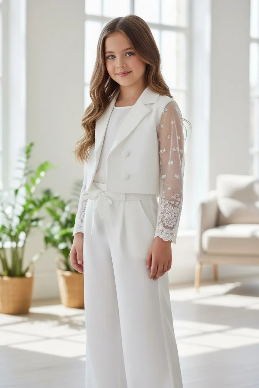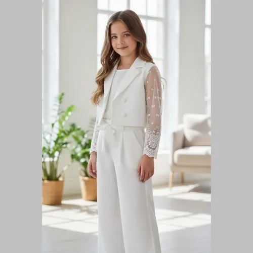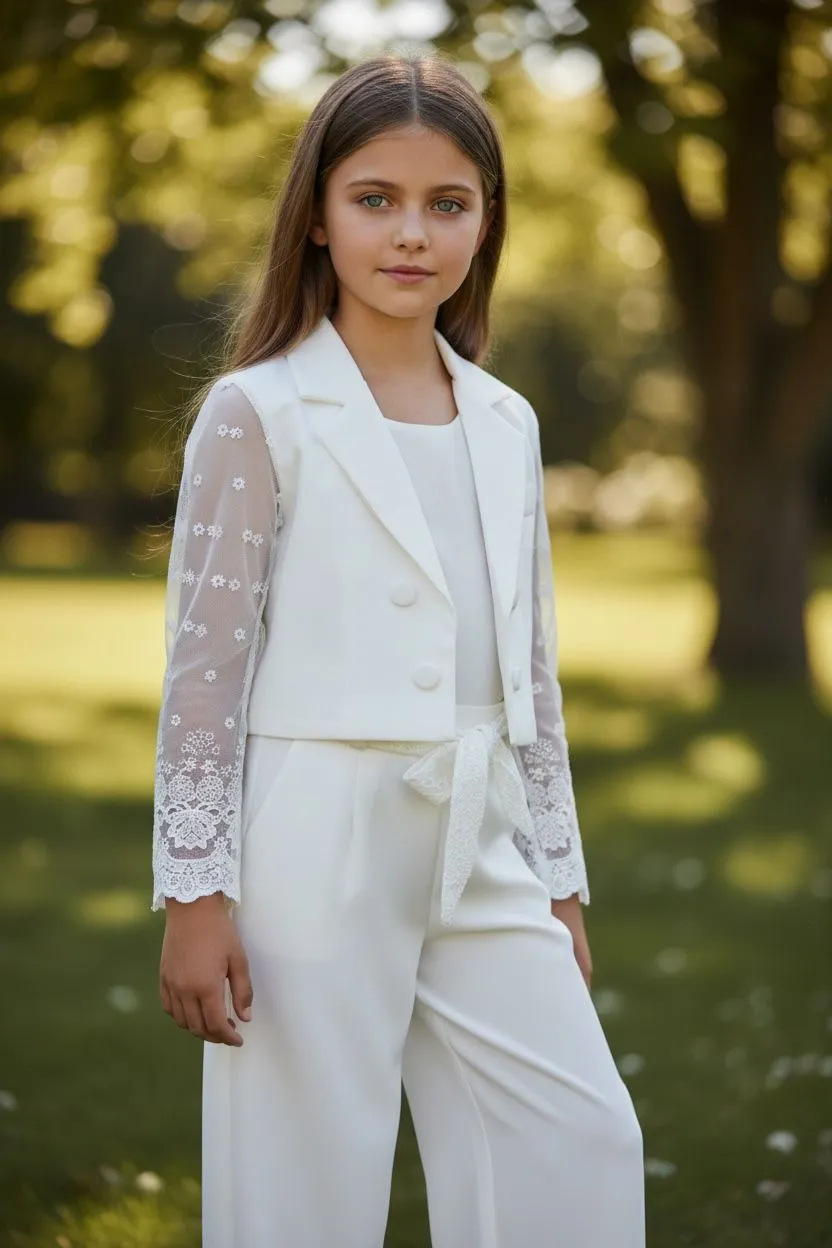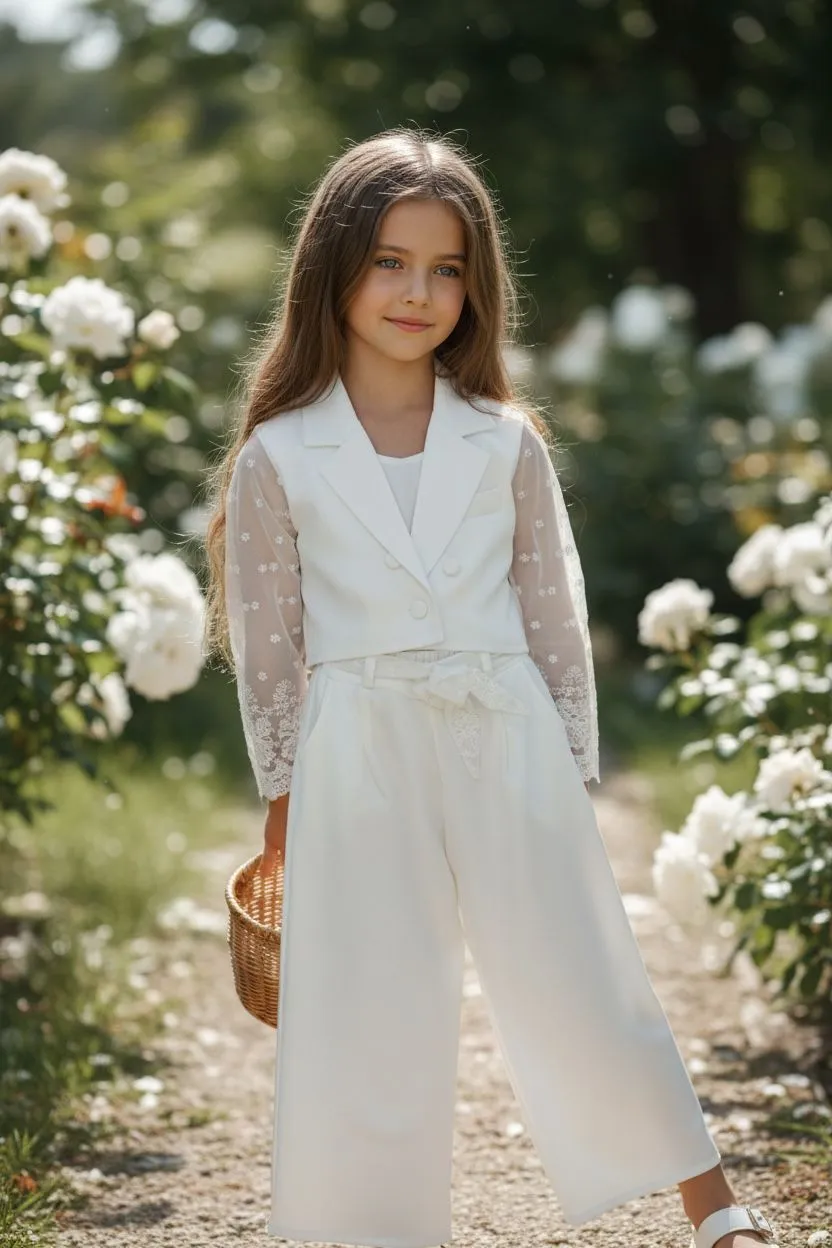 Komplet wizytowy dla dziewczynki z żakietem i spodniami w kolorze ecru